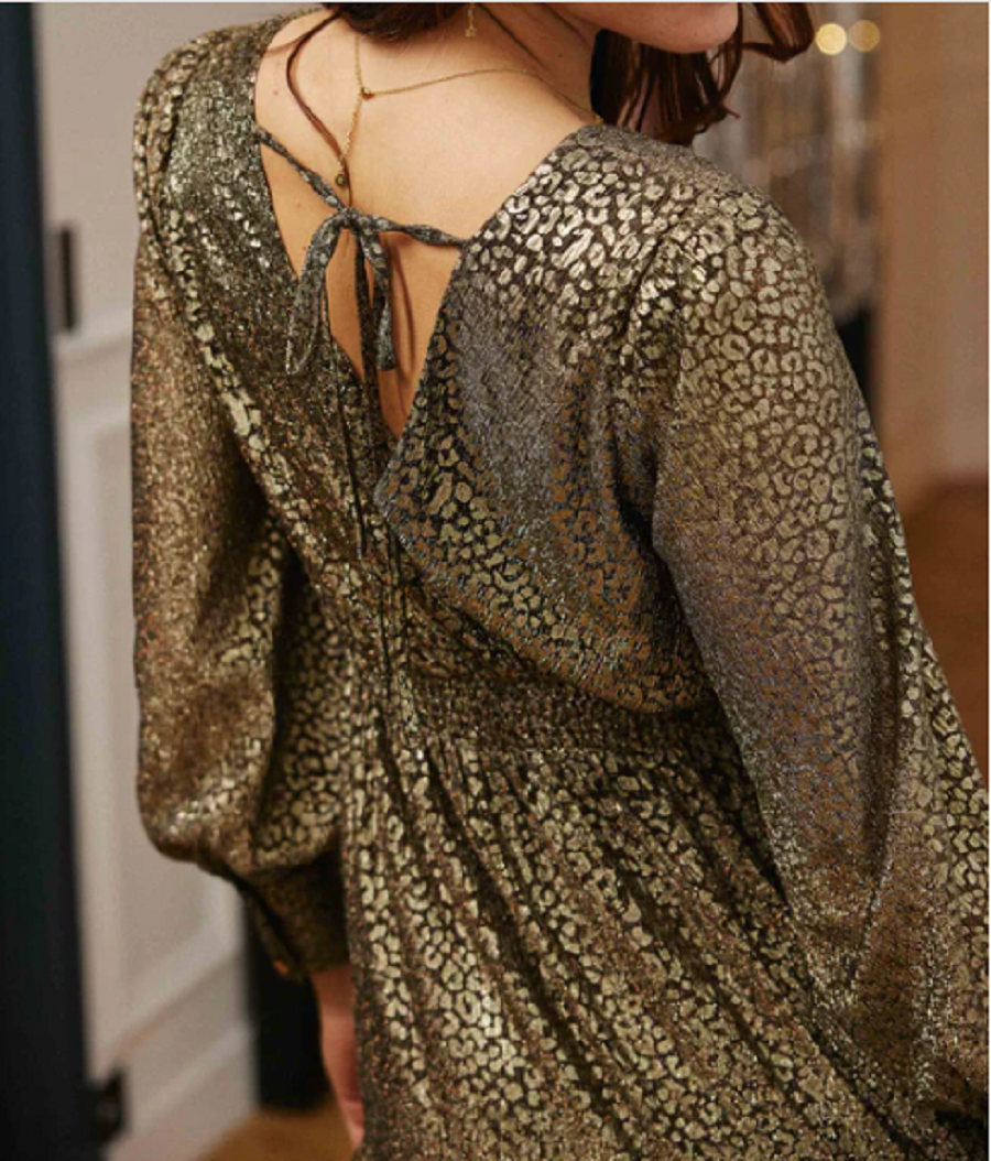 Robe longues imprimé léopard, tissus en voile de jersey métallique, bouton pression à la poitrine, décolleté en V sur le devant et sur le dos