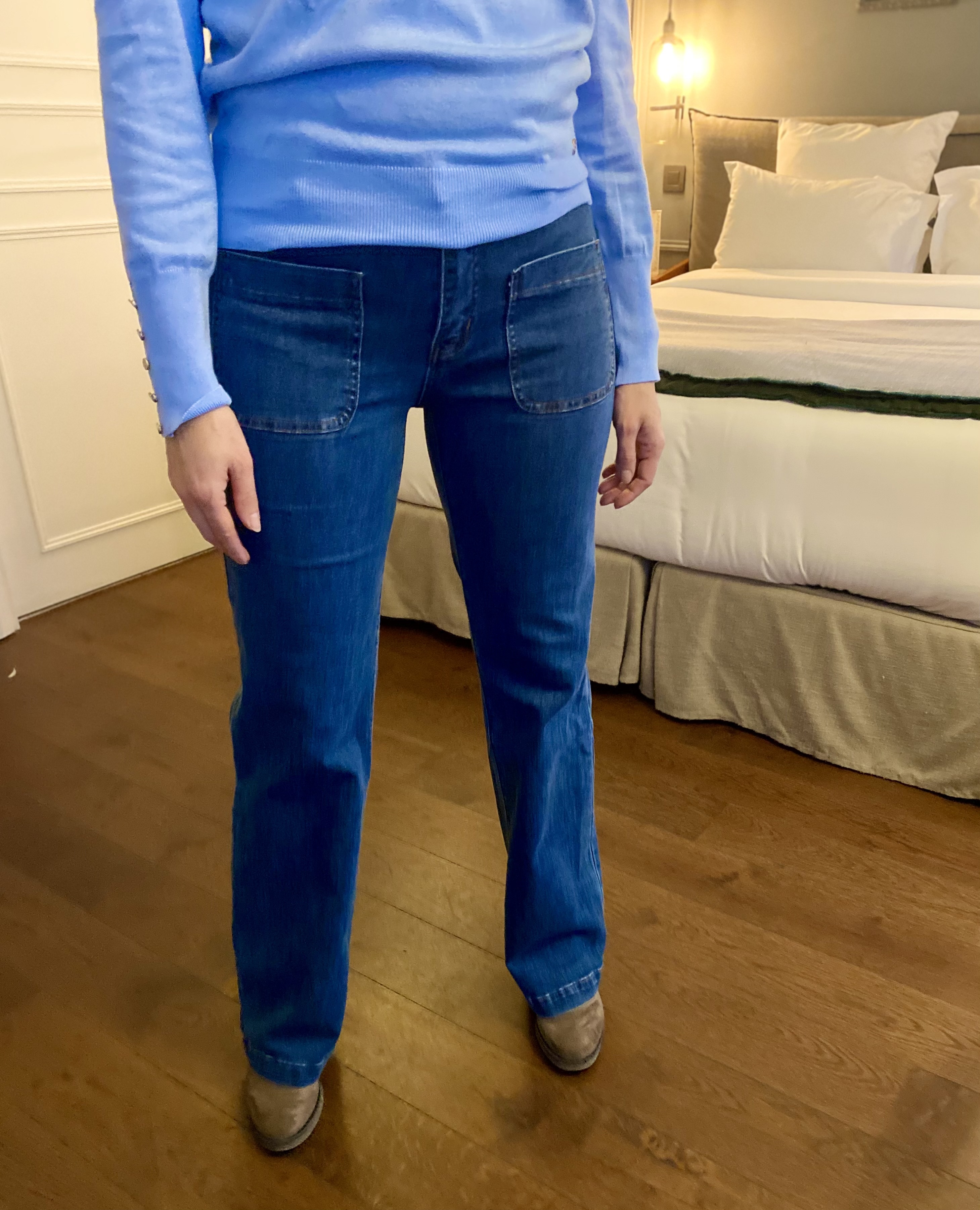 Jean évasé en bas de jambe avec deux poches plaqués sur le devant.