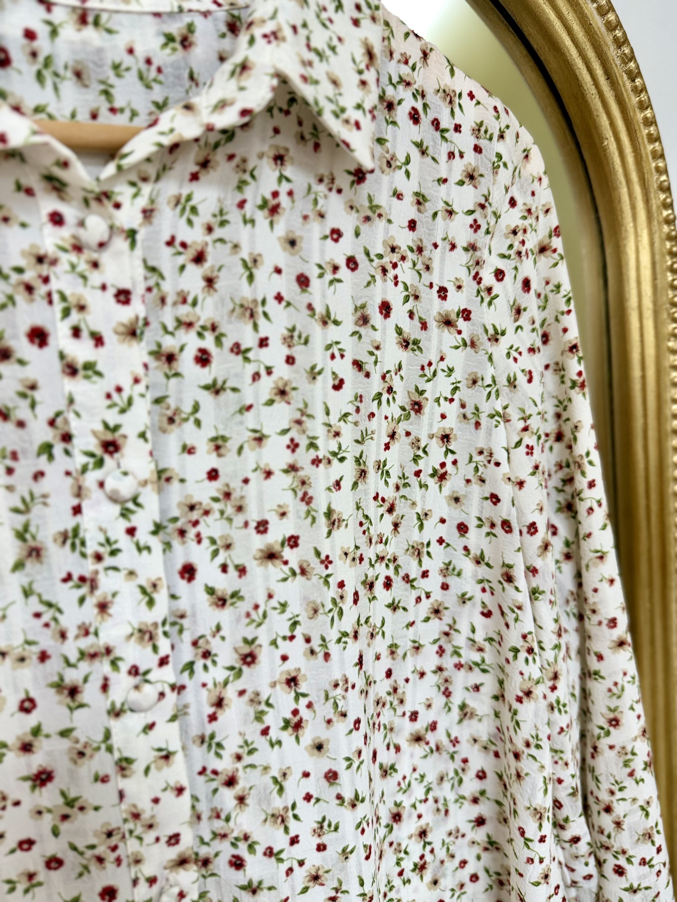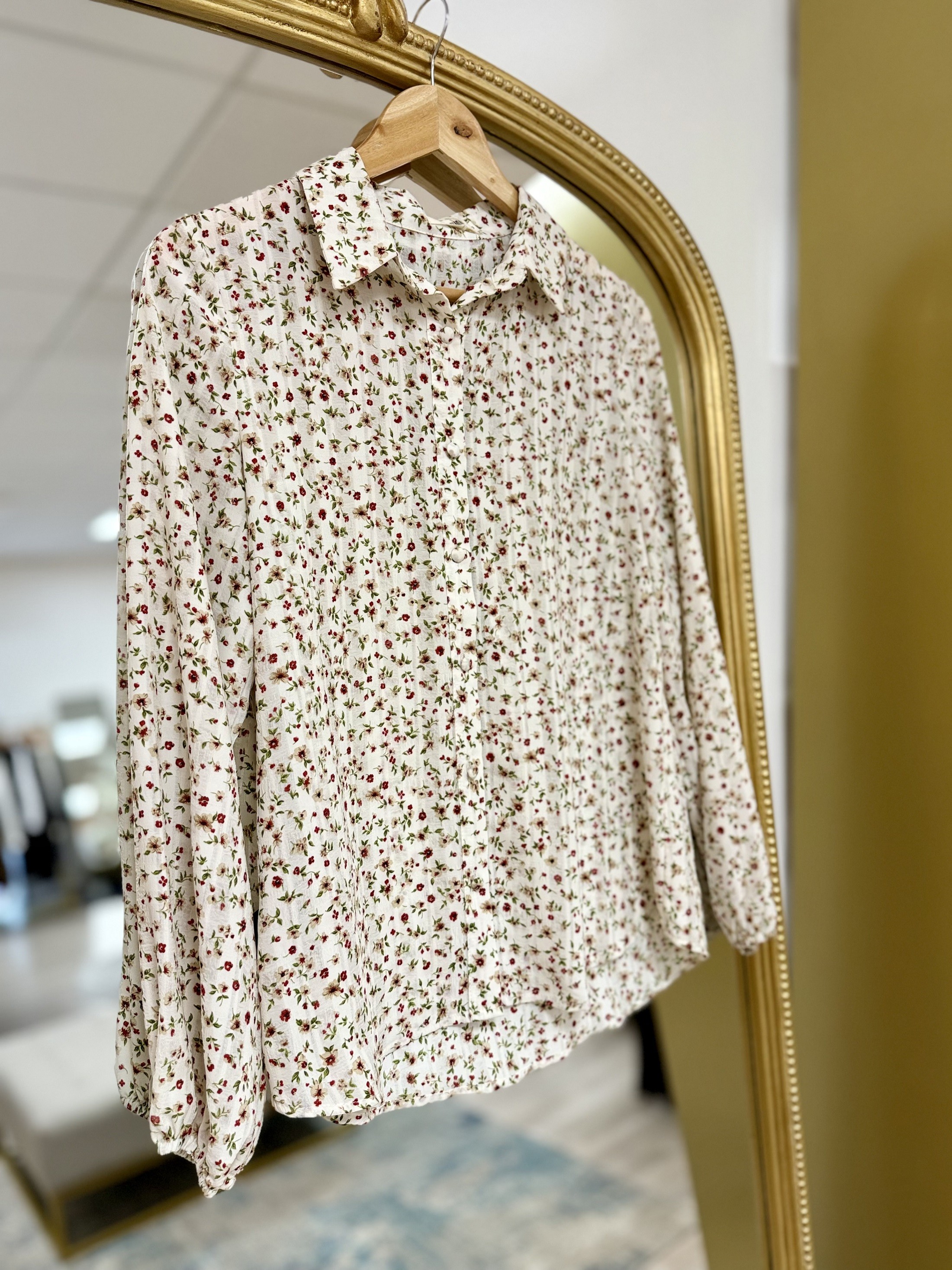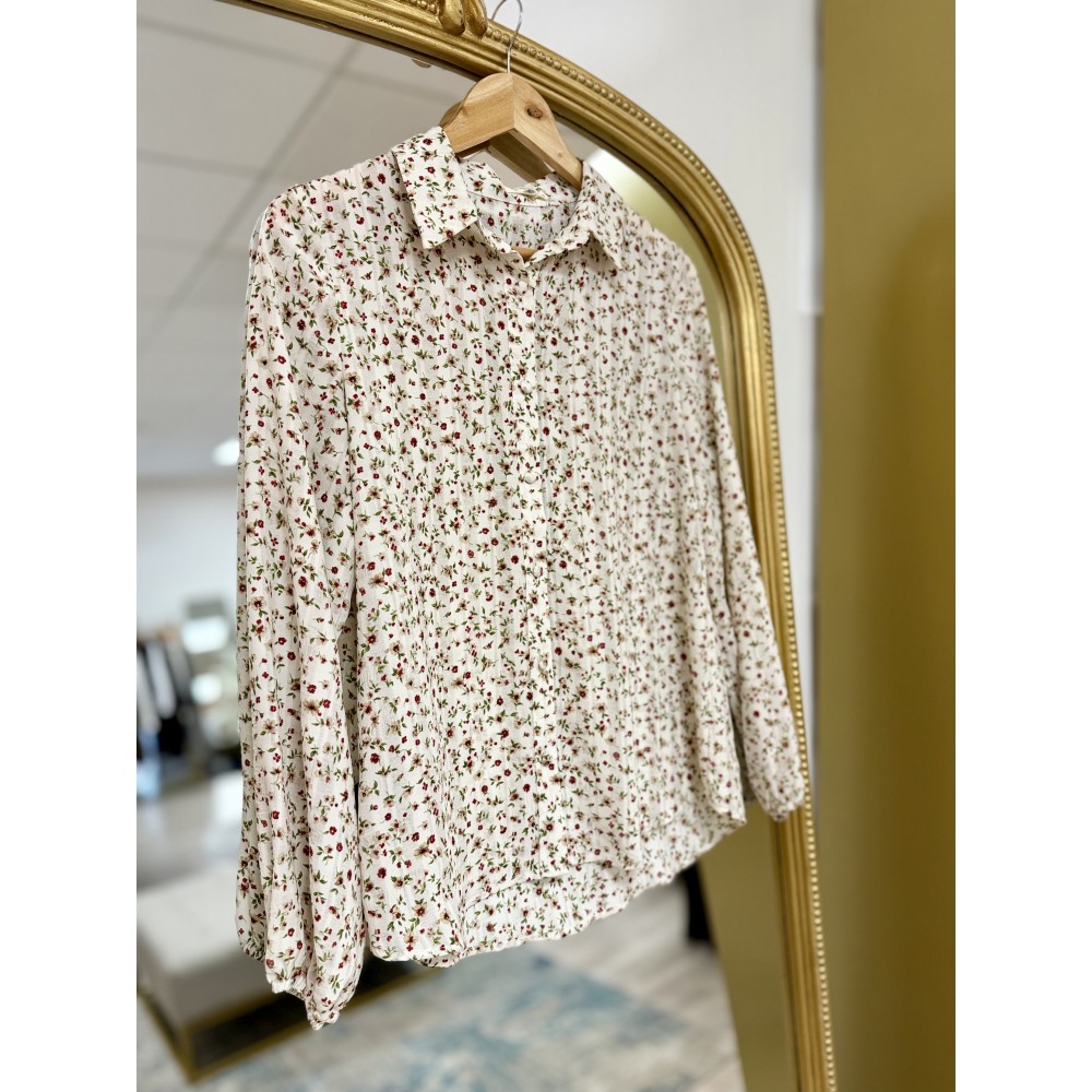 Chemisier écru à imprimer fleuri apporte une touche délicate et romantique à votre tenue. Ce chemisier est un intemporel qui se porte facilement en toute saison.