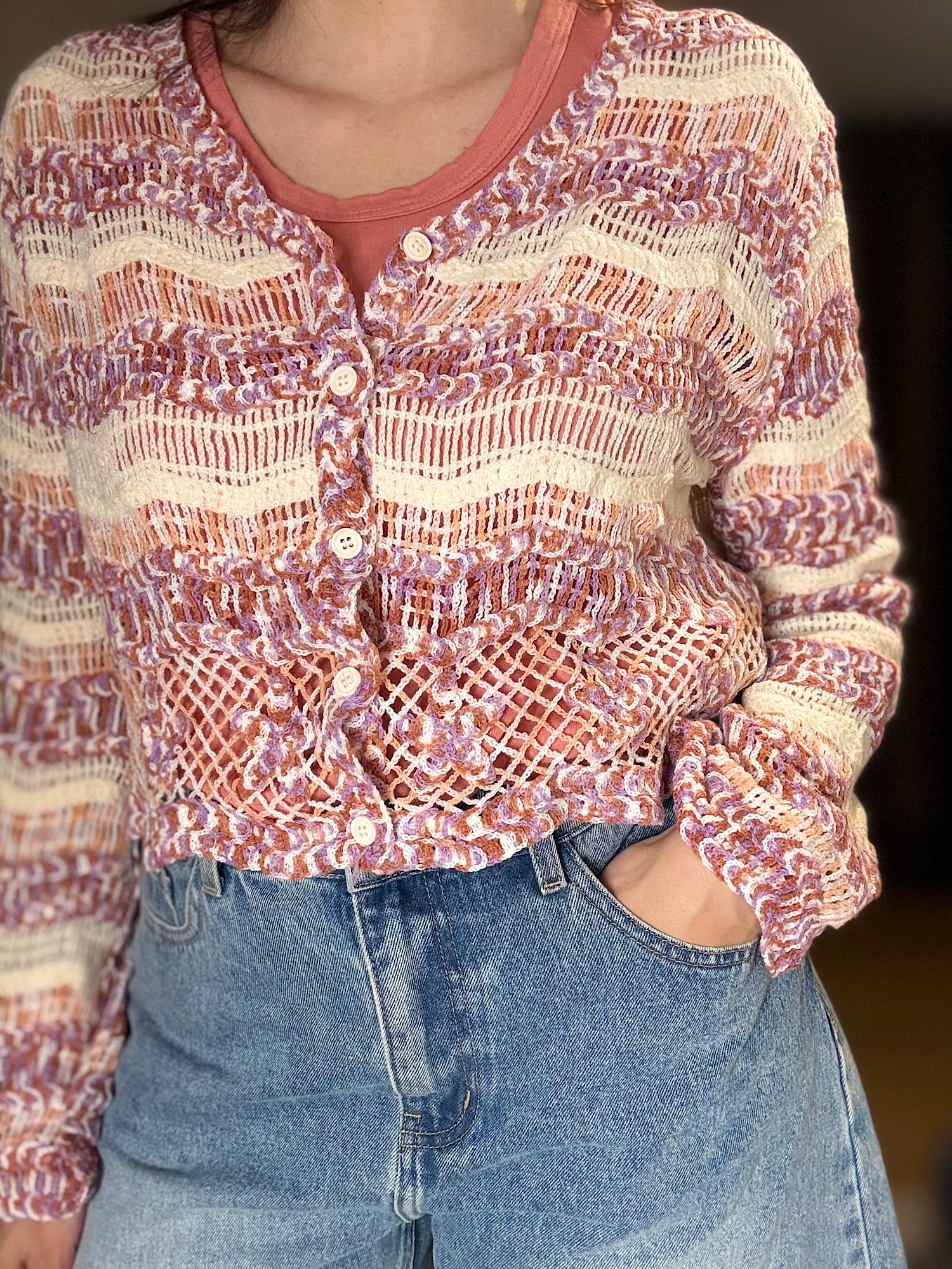 Gilet en crochet. couleur : écru, Parme, terracotta, pêche. Boutonnage sur le devant, avec un col en V. Taille unique,