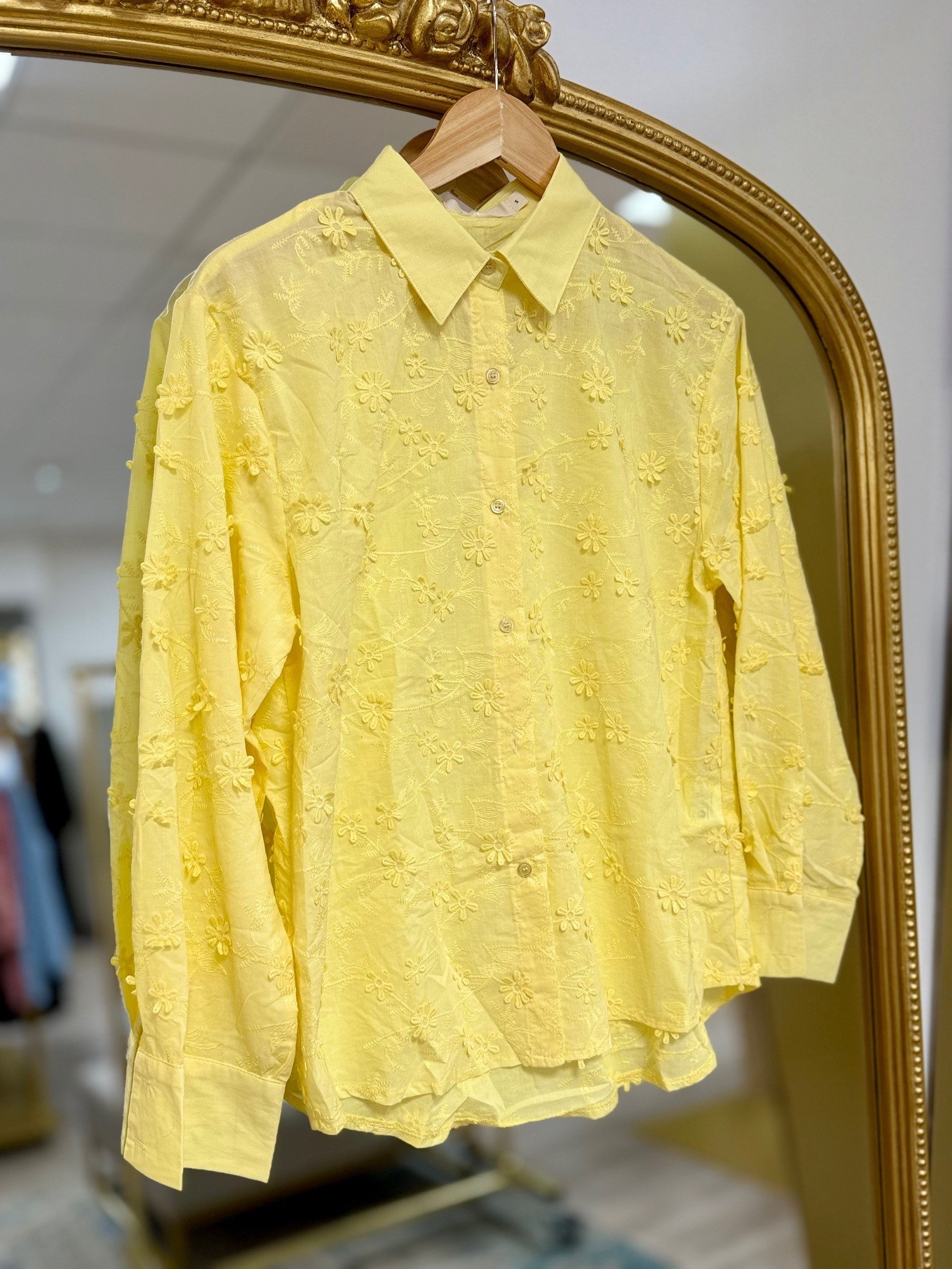 Chemise jaune, boutonnage sur le devant et broderie fleurs