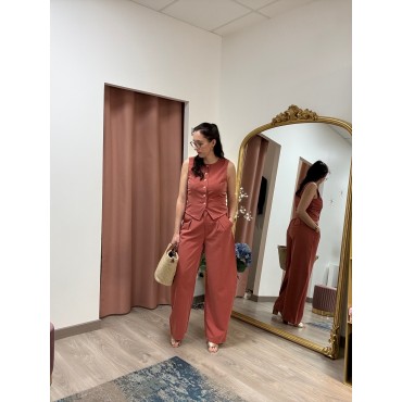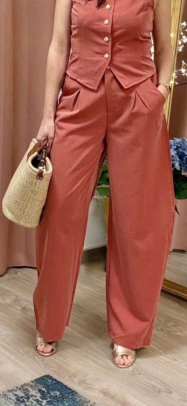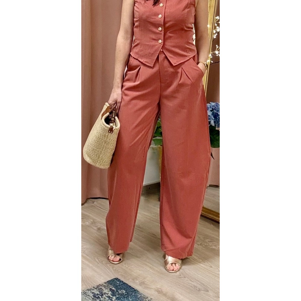 Pantalon chic et élégant, taille haute, élastique sur l'arrière et détail bouton coquillage sur le devant